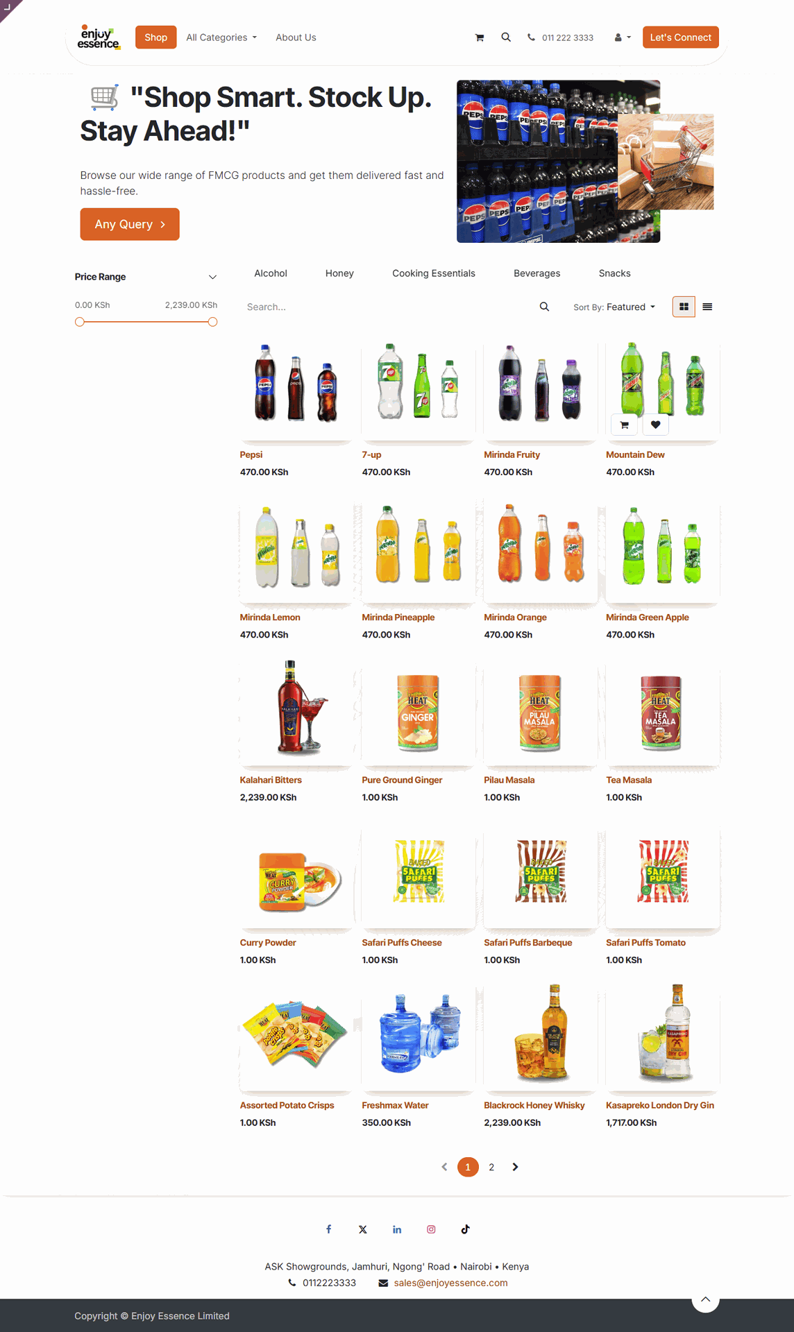 Welcome to Enjoy Essence, a premier distributor of fast-moving consumer goods (FMCG) in Nairobi and its environs. We specialize in supplying high-quality beverages, alcoholic drinks, cooking essentials, honey, and snacks to retail stores, supermarkets, restaurants, and hospitality businesses.